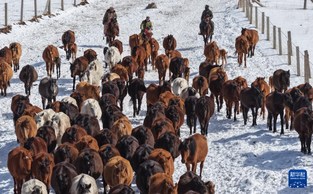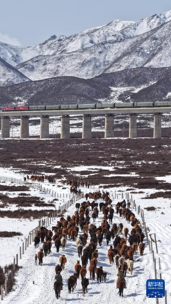 4月14日,山丹马场的牧马人组织马群转场(无人机照片)。