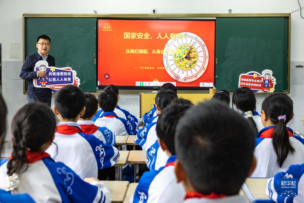 4月14日,贵州省安顺市国家保密局宣讲员在安顺市第七小学为学生讲解国家安全知识。