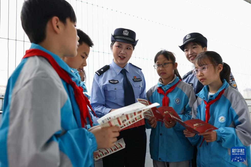 4月14日,在江苏省淮安市洪泽城南实验小学,民警给学生讲解国家安全知识。