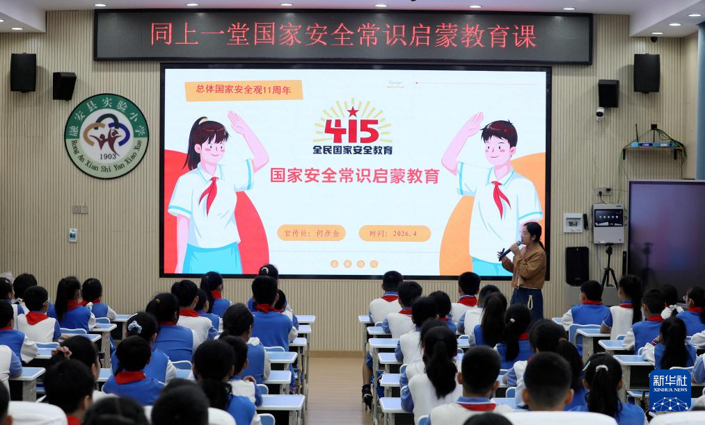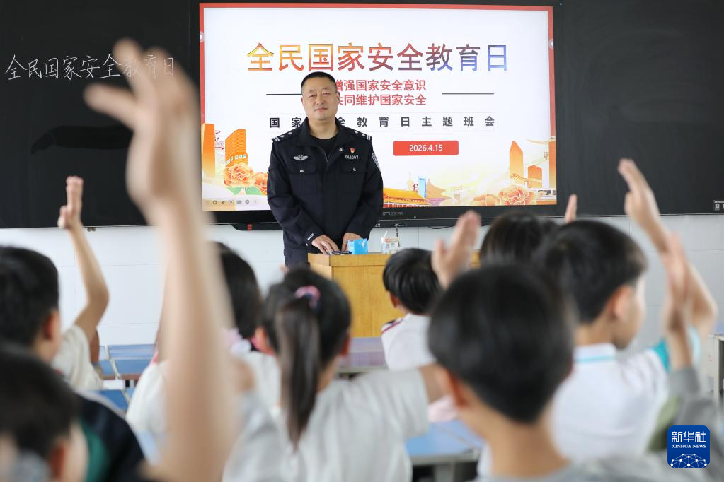 4月14日,在浙江省嘉兴市三水湾小学,学生们在“全民国家安全教育日”主题课上学习国家安全知识。