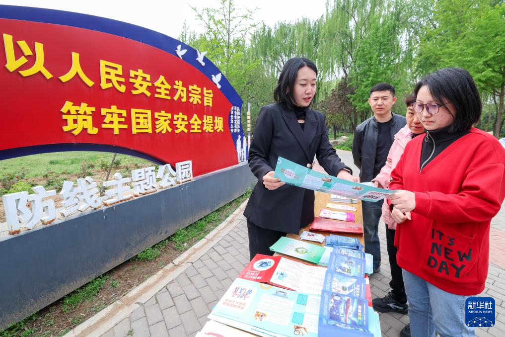 4月14日,在河北省石家庄市新华区石太公园,普法工作人员(左一)为群众讲解国家安全相关知识。