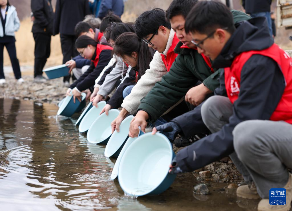 4月15日,大学生志愿者参与增殖放流活动。
