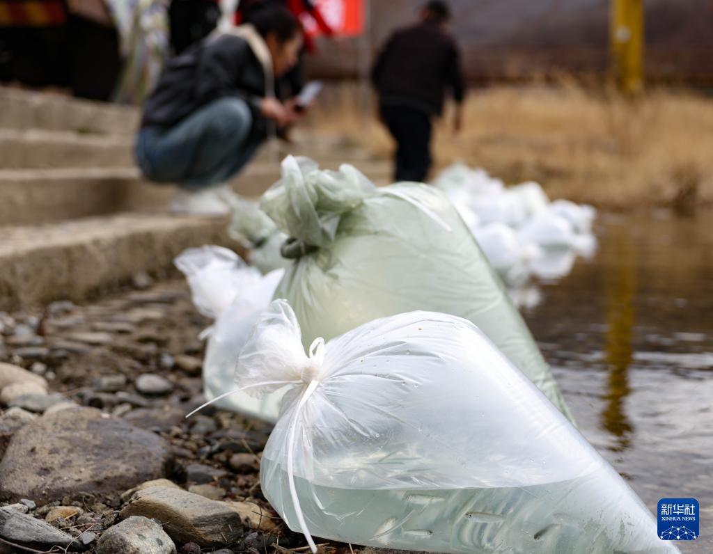 4月15日,工作人员将鱼苗分拣包装好,等待放入江水中。