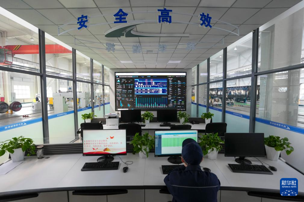 技术人员在中国铁路哈尔滨局集团有限公司哈尔滨车辆段轮轴车间数智管控平台监测设备运行参数(4月15日摄)。