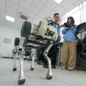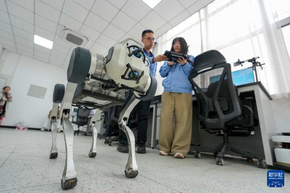 在哈尔滨国铁科技集团股份有限公司试验基地,技术人员对应用于铁路物流质量管控的机器狗进行安全性及可靠性评估测试(4月15日摄)。