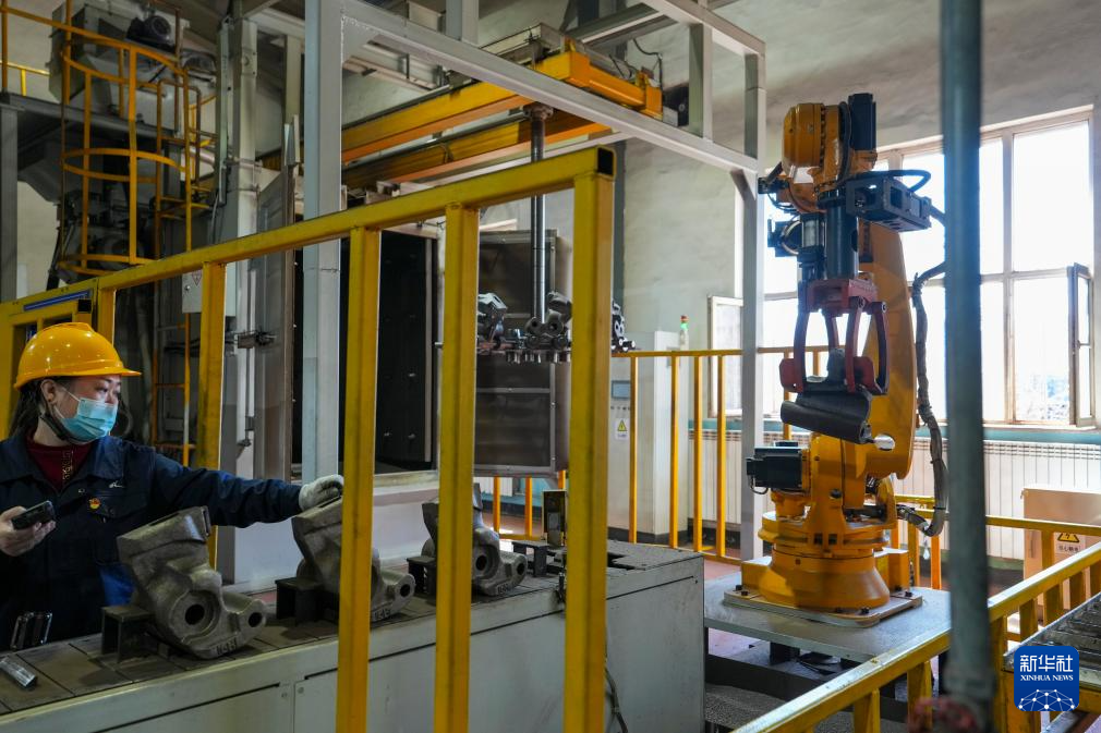 机器人在中国铁路哈尔滨局集团有限公司哈尔滨车辆段钩缓车间对火车车体组件进行维护保养作业(4月15日摄)。