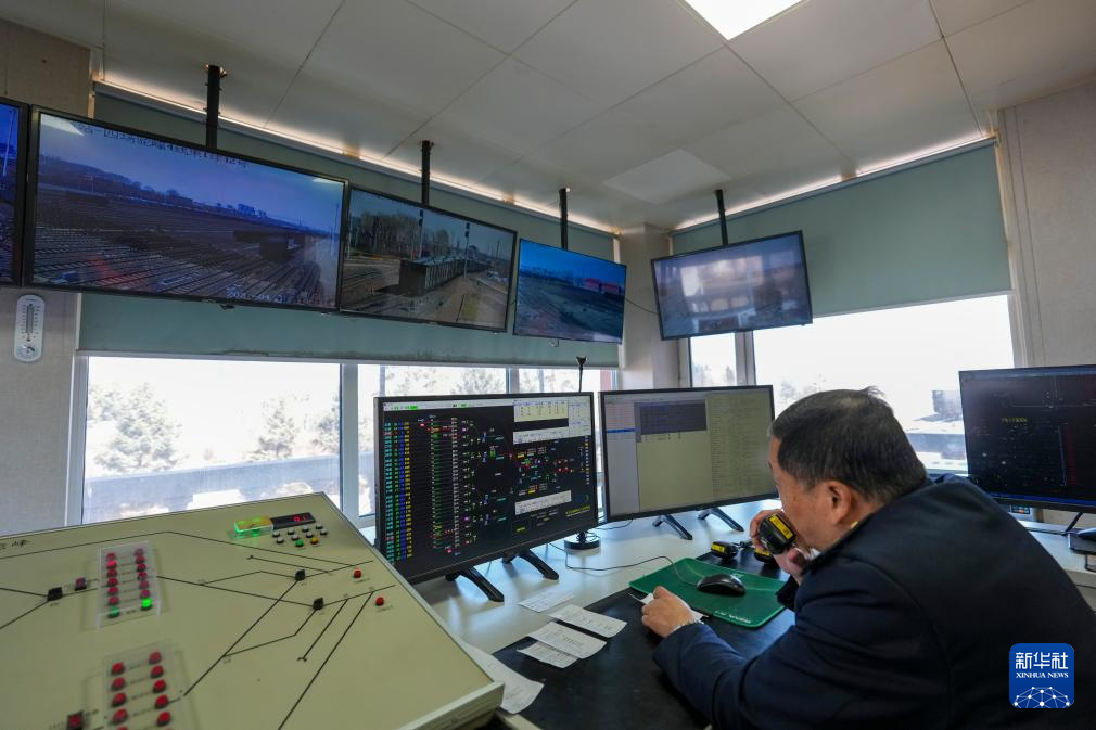 在哈尔滨南站编组车间,工作人员借助智能驼峰控制信息系统对货运列车开展编组作业(4月15日摄)。自该系统投用以来,哈尔滨南站整体编组效率提升了25%以上。