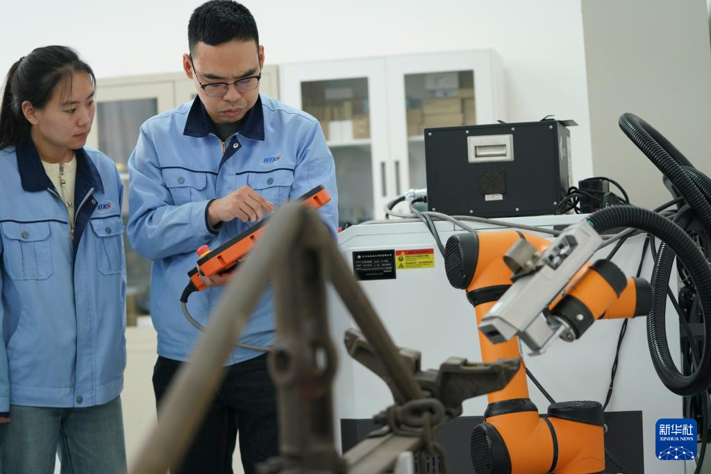 在哈尔滨国铁科技集团股份有限公司试验基地,技术人员对铁路列车检修机器人的性能进行安全性及可靠性评估测试(4月15日摄)。