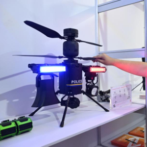 4月15日,广交会无人机参展商介绍一款警用无人机产品。