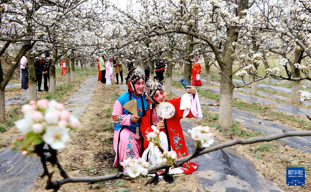4月18日,甘肃省平凉市静宁县界石铺镇李堡村,来自县戏剧家协会的秦腔演员在梨园打卡拍照。
