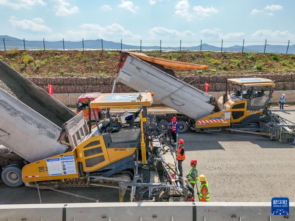 4月18日,在四川省绵阳市境内的G5京昆高速广元至绵阳段扩容工程路面工程施工现场,无桩化智能摊铺机进行施工作业(无人机照片)。