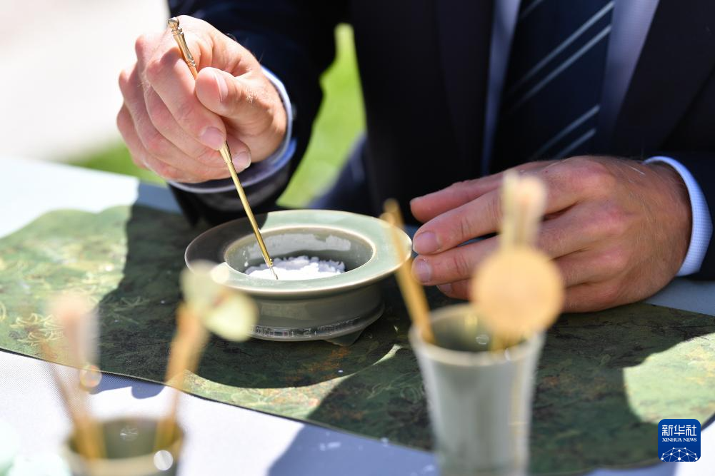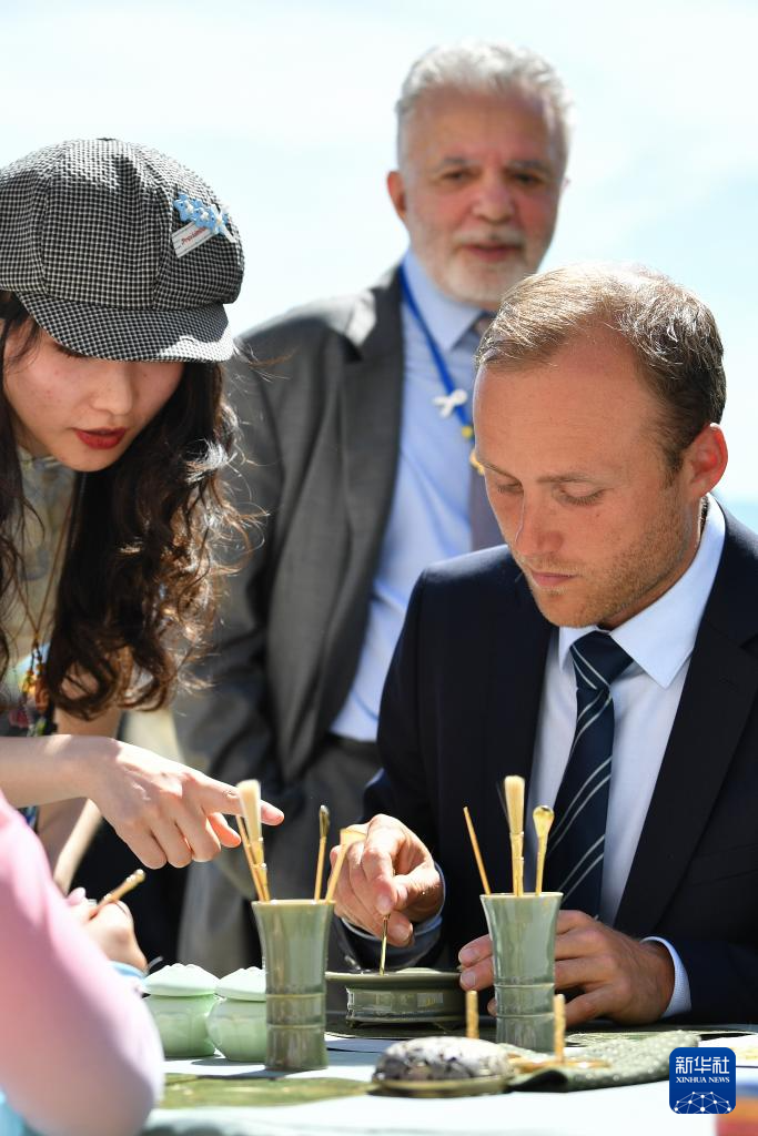 4月17日,在瑞士日内瓦万国宫,嘉宾在体验宋式篆香。