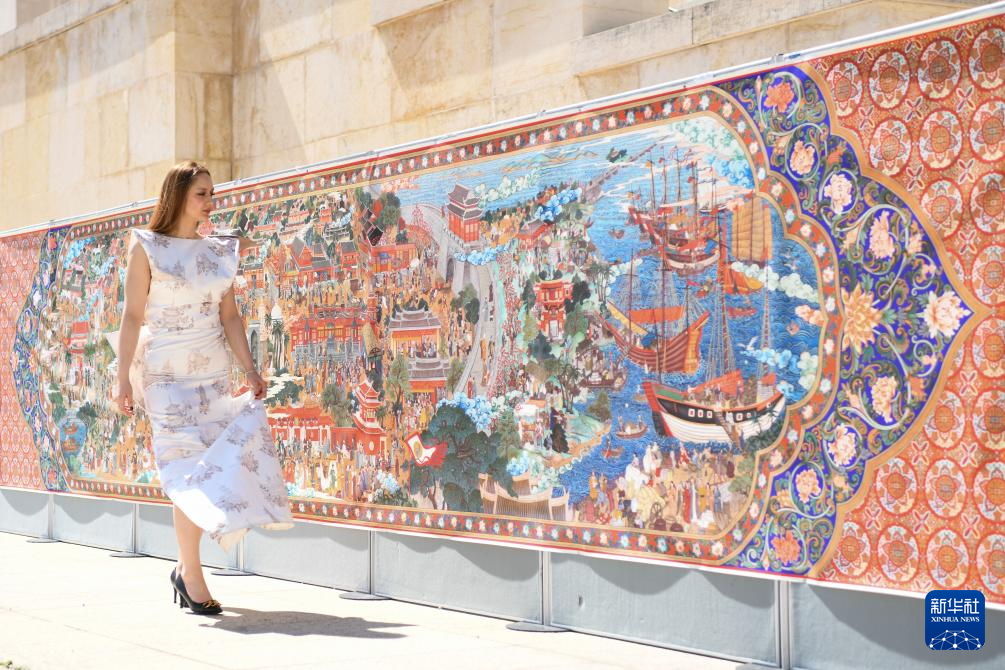 4月17日,在瑞士日内瓦万国宫,模特身着福建省泉州市鲤城区非遗时尚服装在泉州海丝唐卡百米长卷《世界商埠》前走过。