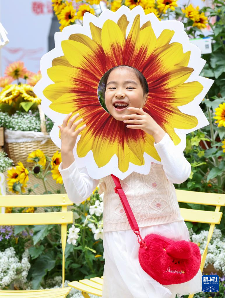 4月18日,小女孩在上海市黄浦区新天地东台里举办的花卉市集上打卡拍照。