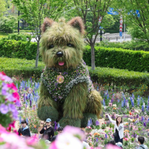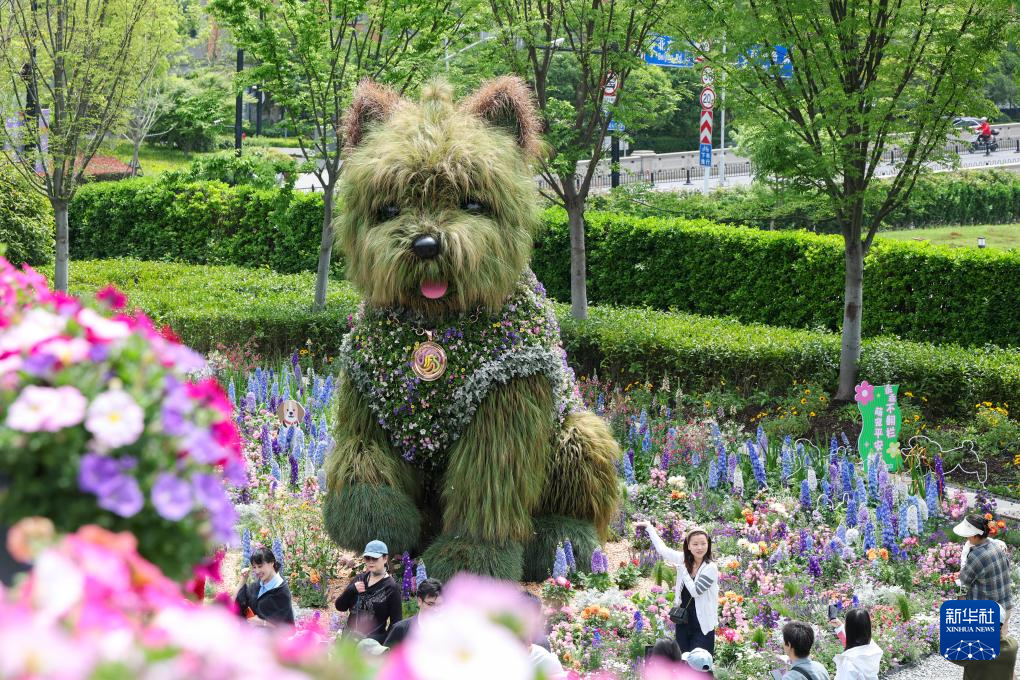 4月18日,游客在上海市静安区万象天地花卉市集上和“潦草小狗”打卡合影。