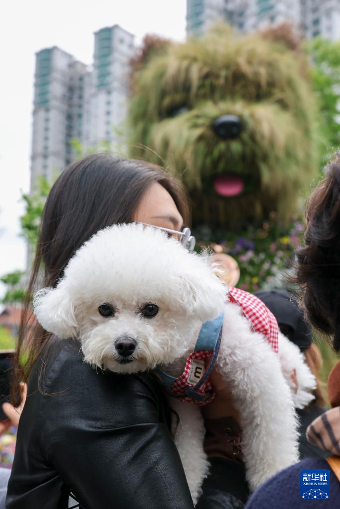 4月18日,市民携带宠物在上海市静安区万象天地花卉市集上和“潦草小狗”打卡合影。