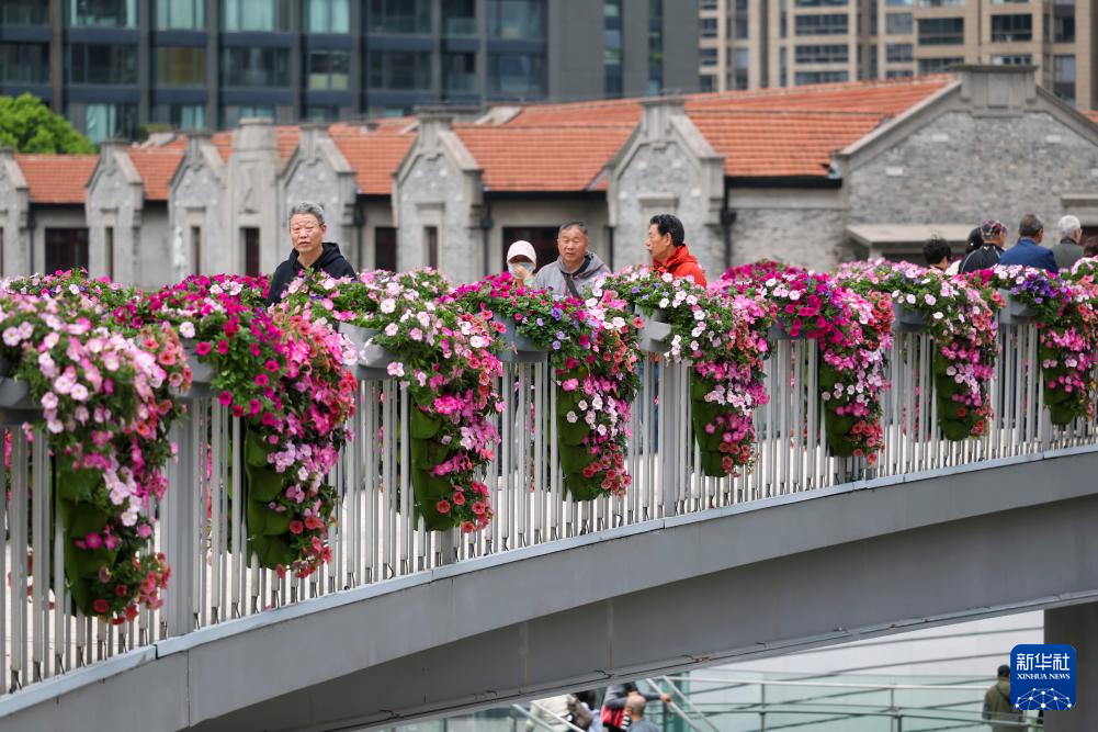 4月18日,人们在上海市静安区万象天地花卉市集上游览。