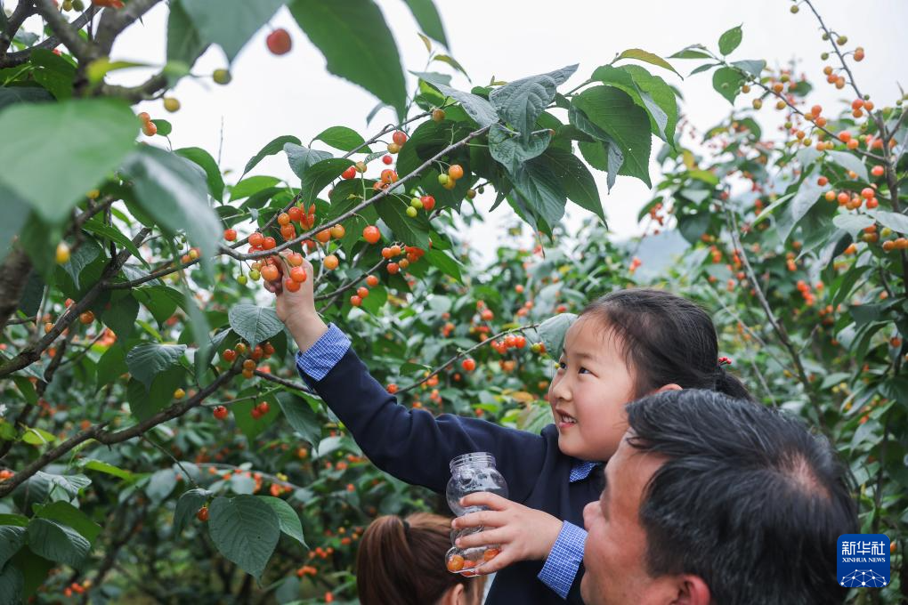 4月18日,游客在赵家镇的樱桃园里采摘首批成熟的樱桃。
