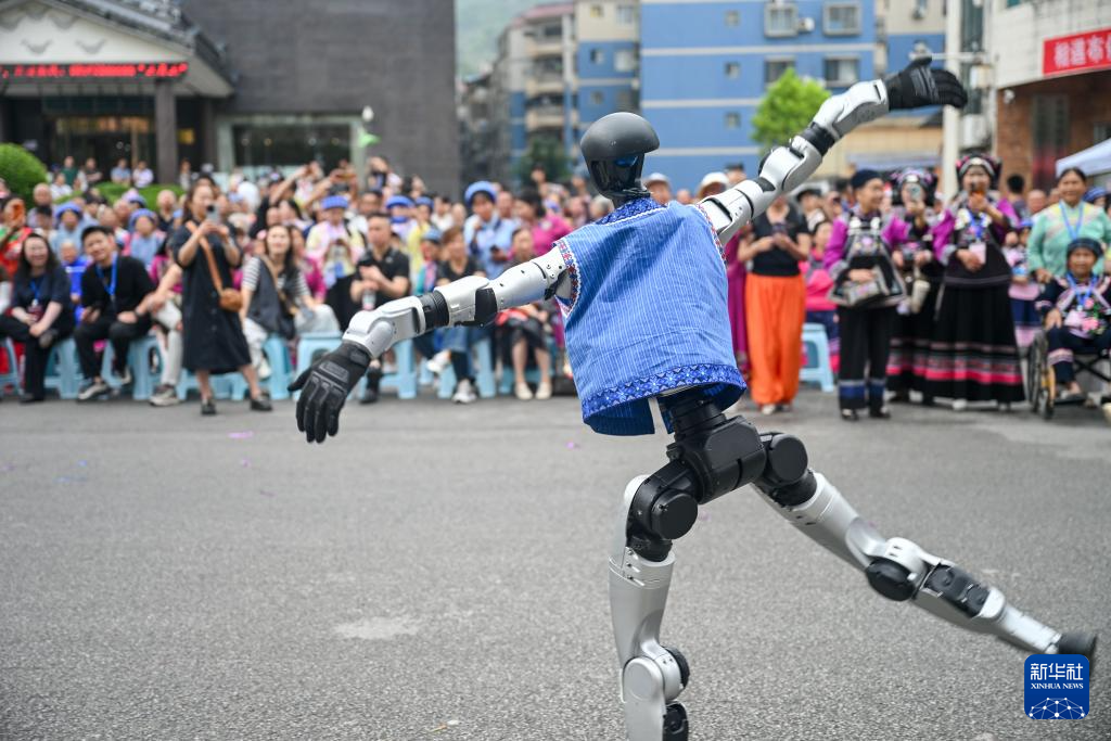 4月19日,在贵州省黔西南布依族苗族自治州望谟县,机器人在民族大联欢巡演活动中表演。