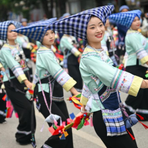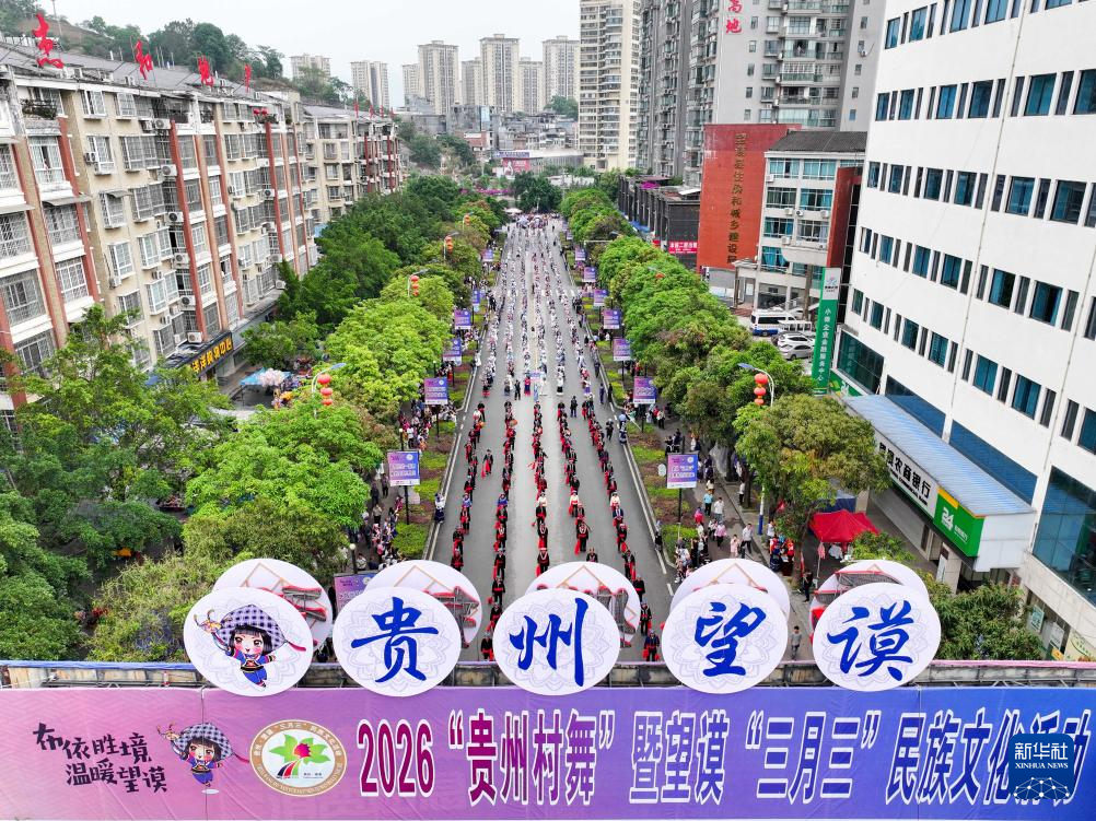 4月19日,在贵州省黔西南布依族苗族自治州望谟县,人们身着盛装参加民族大联欢巡演活动(无人机照片)。