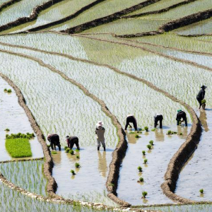 4月18日,村民在梯田上插秧。