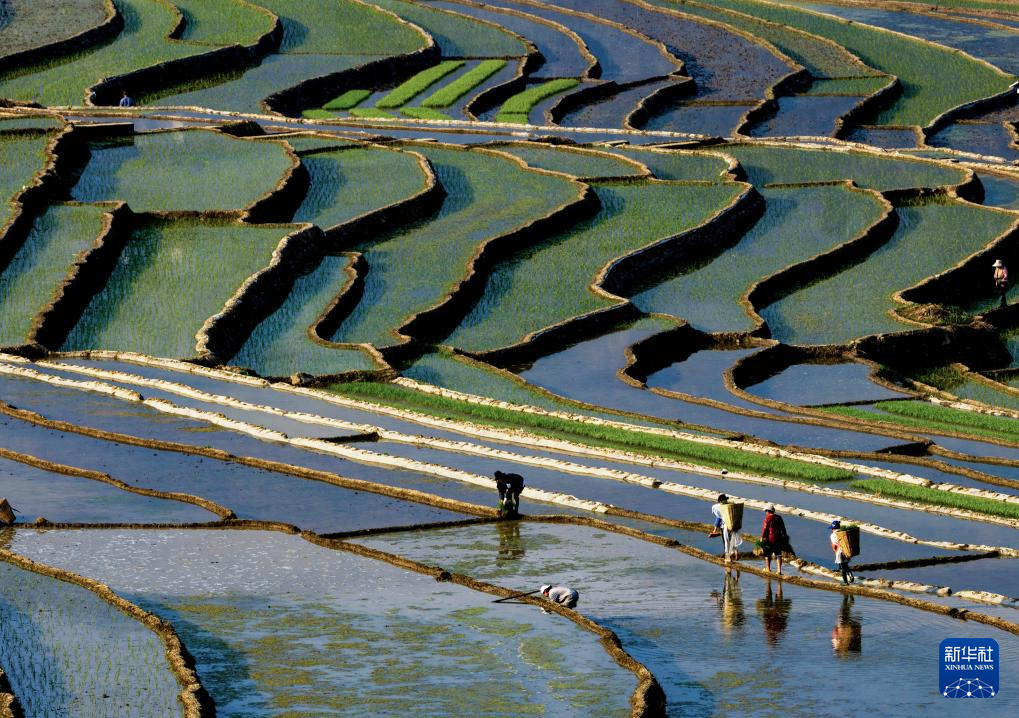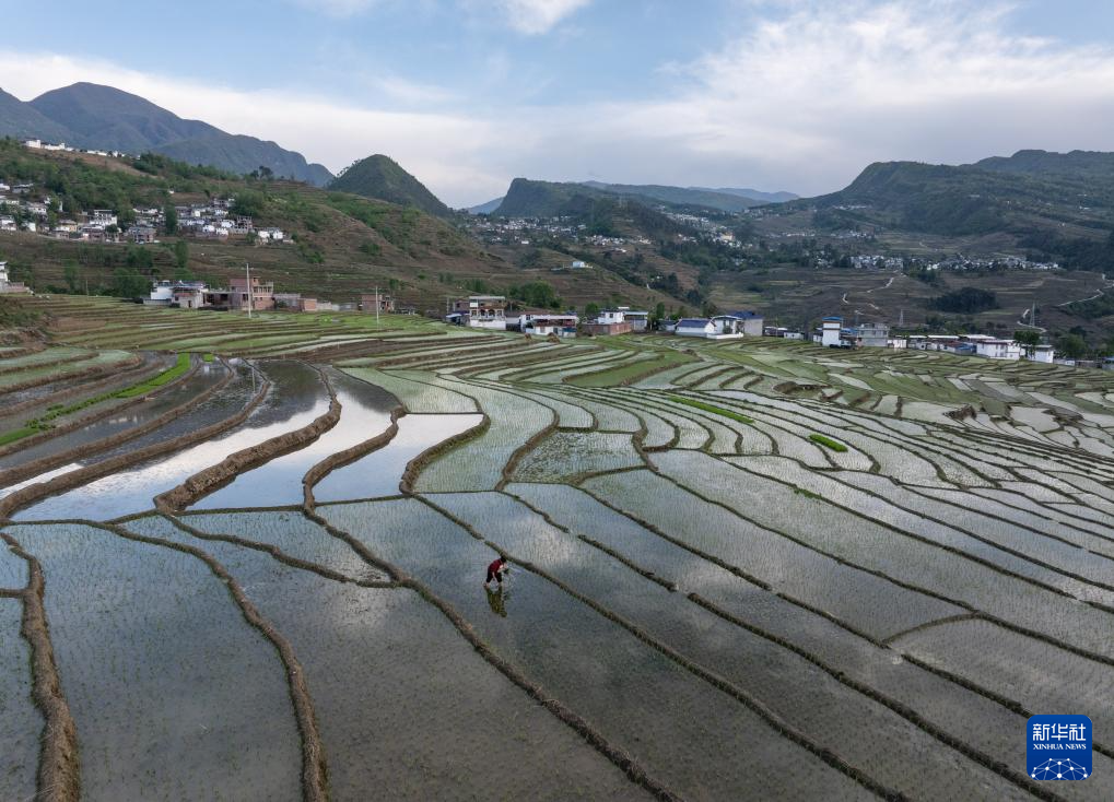 目前,四川省凉山彝族自治州甘洛县普昌梯田进入农忙时节。村民们在如镜映天的田里忙着插秧、劳作。