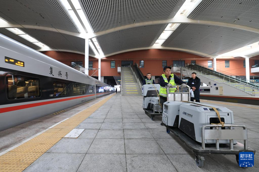 4月19日,在哈尔滨西站,中铁快运哈尔滨西站营业部工作人员准备将“智能座舱”运输箱搬运到哈尔滨西开往北京朝阳的G118次列车车厢内。
