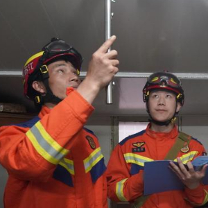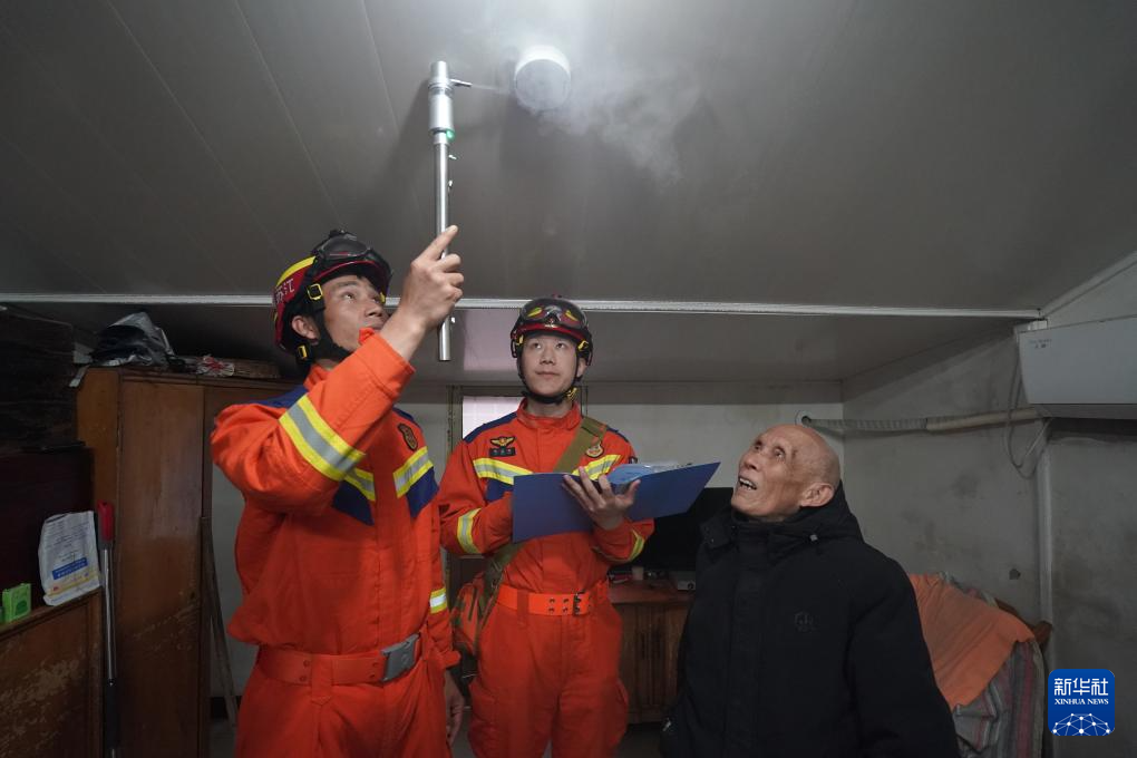 在东关街羊巷周福喜(右)老人家中,“协同治理合伙人”消防救援局东关街政府专职消防队队员检测并记录烟感报警器运行情况(4月16日摄)。
