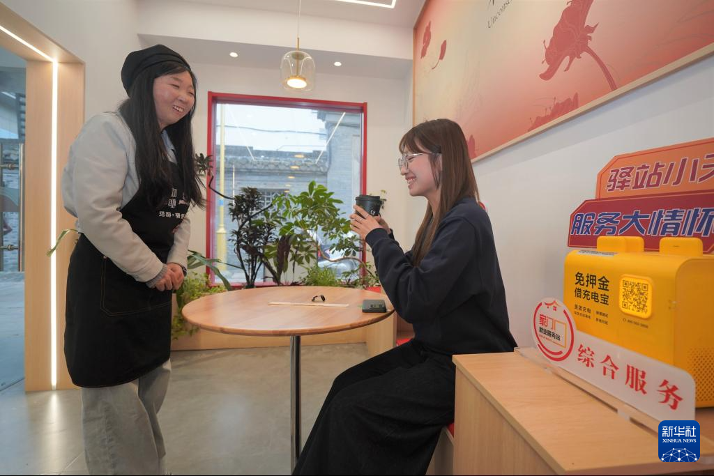 在扬州市广陵区东关街道琼花观社区游客服务中心,“公益服务合伙人”黄智玥(左)为游客送上咖啡(4月16日摄)。