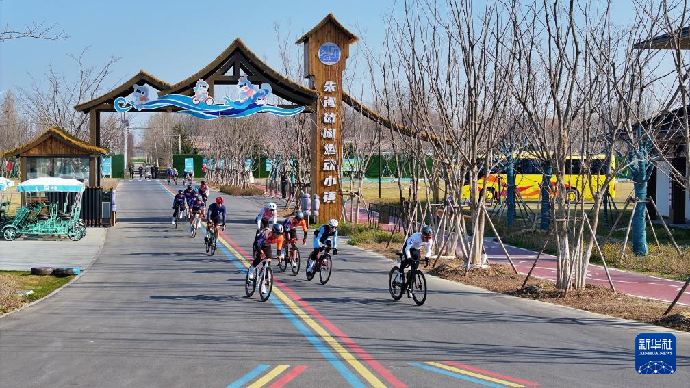 人们在朱海休闲运动小镇参加大运河骑行活动(2025年3月16日摄)。江苏省宿迁市王官集镇的朱海休闲运动小镇是在朱海水环境治理基础上打造的生态旅游项目,项目总占地约8900亩。朱海曾一度因养殖尾水问题而背上了沉重的“生态包袱”。2020年,朱海启动水环境综合整治项目,实施水系连通工程,曾经的“一潭死水”变为流动的活水。