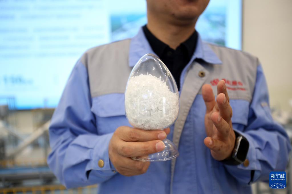 2026年3月26日,在芮邦科技有限公司,公司负责人展示用于制作成再生涤纶长丝的塑料瓶碎片。成立于2020年的芮邦科技有限公司位于江苏省宿迁市泗阳县,专注再生涤纶长丝的研发、生产与销售。公司拥有世界领先的循环再利用涤纶长丝熔体直纺技术,是行业内率先践行零碳行动的化纤企业。