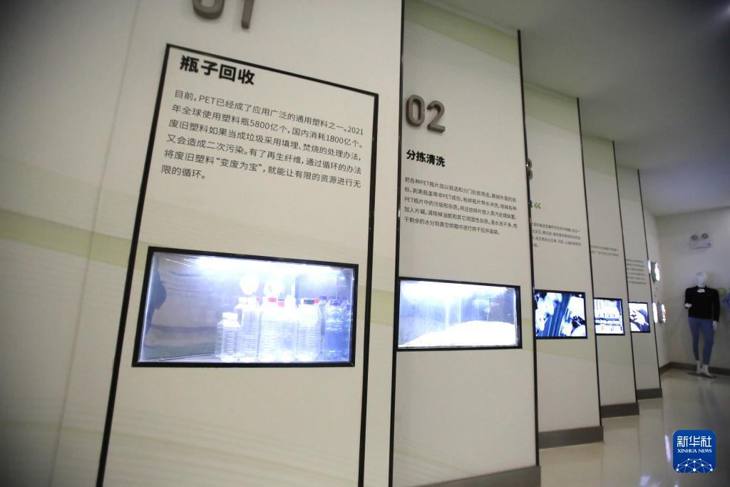 这是在芮邦科技有限公司拍摄的展板,展示塑料瓶制成再生涤纶长丝,再制成衣服的过程(2026年3月26日摄)。成立于2020年的芮邦科技有限公司位于江苏省宿迁市泗阳县,专注再生涤纶长丝的研发、生产与销售。公司拥有世界领先的循环再利用涤纶长丝熔体直纺技术,是行业内率先践行零碳行动的化纤企业。