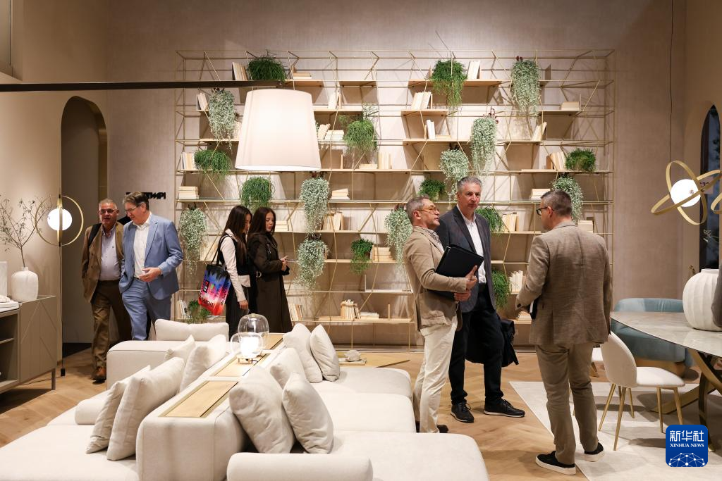 4月21日,在意大利米兰国际会展中心,展商在米兰家具展上洽谈。