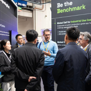 4月21日,人们在德国汉诺威工业博览会中控展台交流。