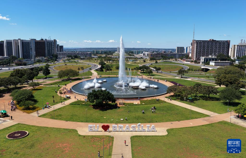 这是4月19日在巴西首都巴西利亚城市中轴线拍摄的一处喷泉(无人机照片)。