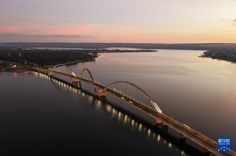 4月20日日出时分,汽车驶过巴西首都巴西利亚的一座大桥(无人机照片)。