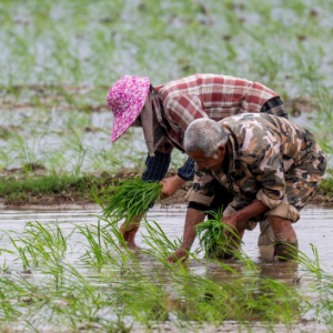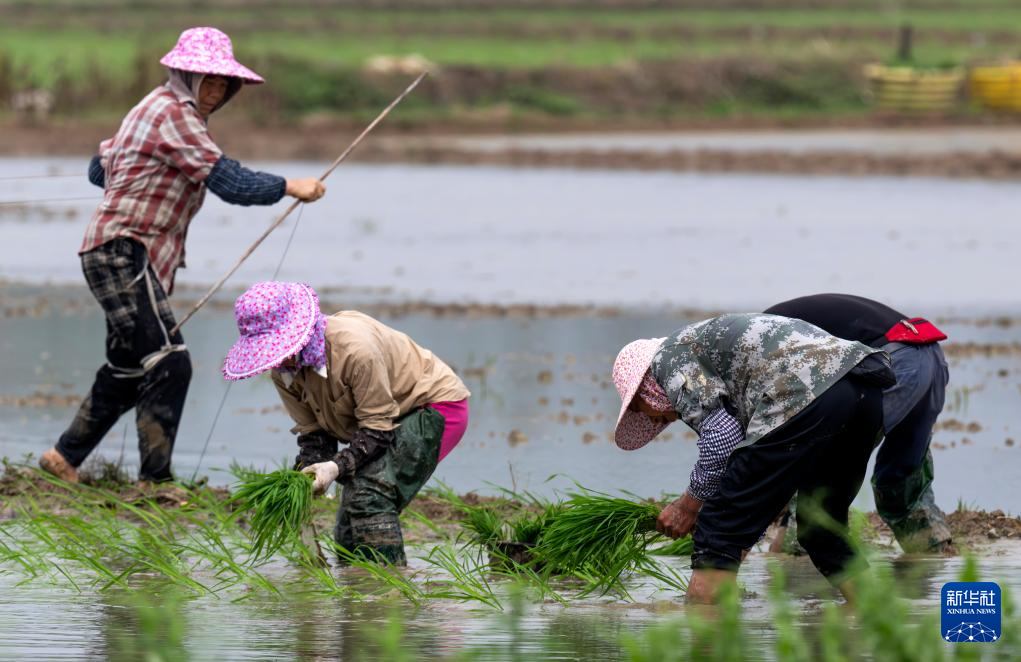4月22日,农户在福建省福州市连江县山堂村稻田里栽插早稻秧苗。