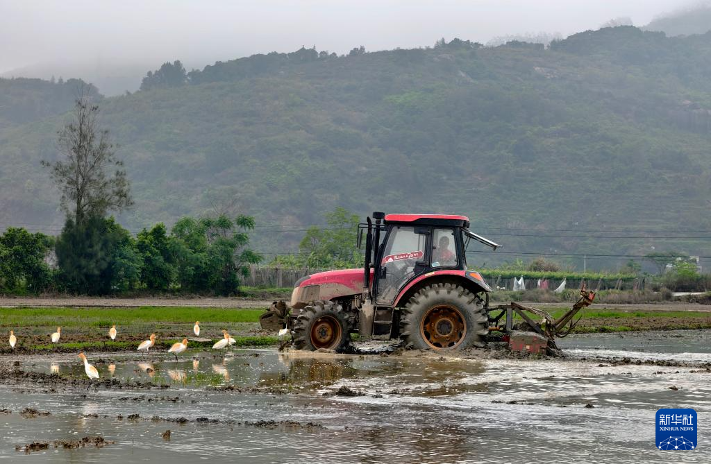 在福建省福州市连江县山堂村,工作人员驾驶犁地机在稻田里作业,为插秧做准备(4月22日摄)。