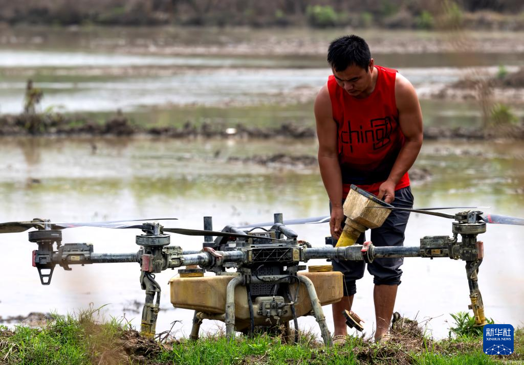 农业技术人员给农业无人机灌装肥料,准备开展稻田施肥作业(4月22日摄)。