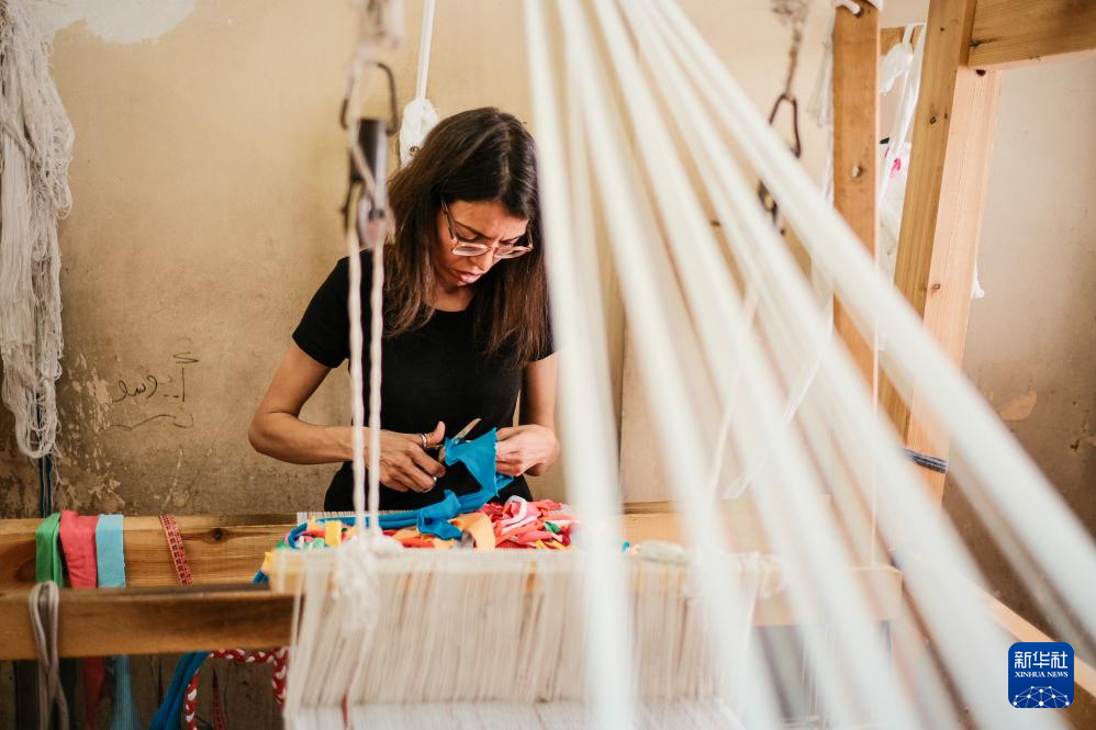 4月21日,在位于埃及开罗“垃圾城”的手工作坊内,工作人员用废旧布料制作手提包。