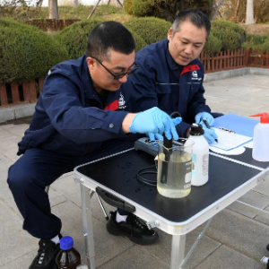 4月22日,在锦州大凌河口湿地,嘉宾观摩当地环保部门工作人员取样检测湿地水质。