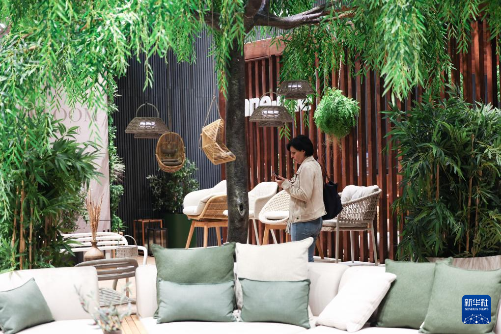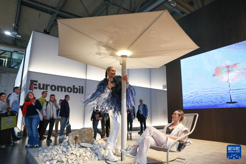 4月22日,在意大利米兰国际会展中心,人们在米兰家具展参观户外用品。