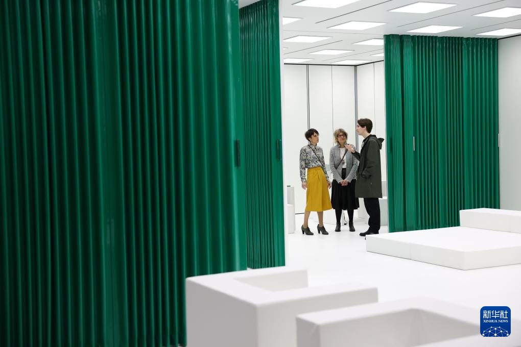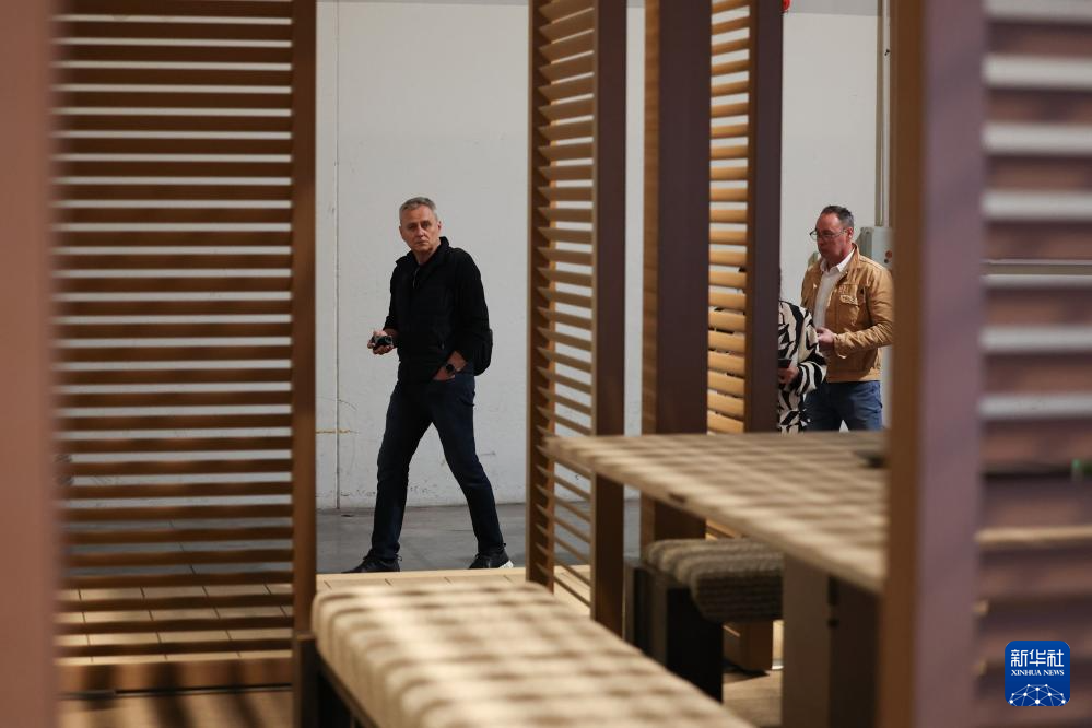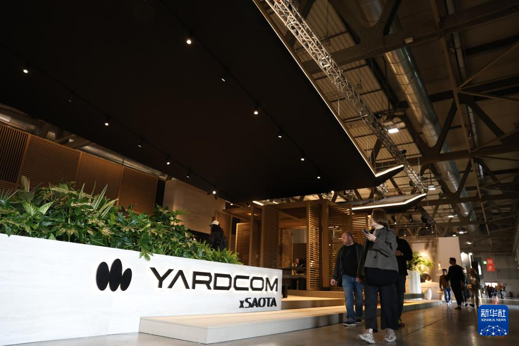 4月21日,在意大利米兰国际会展中心,人们在米兰家具展上参观中国品牌“院半”与南非建筑师事务所SAOTA联合推出的户外设计方案。