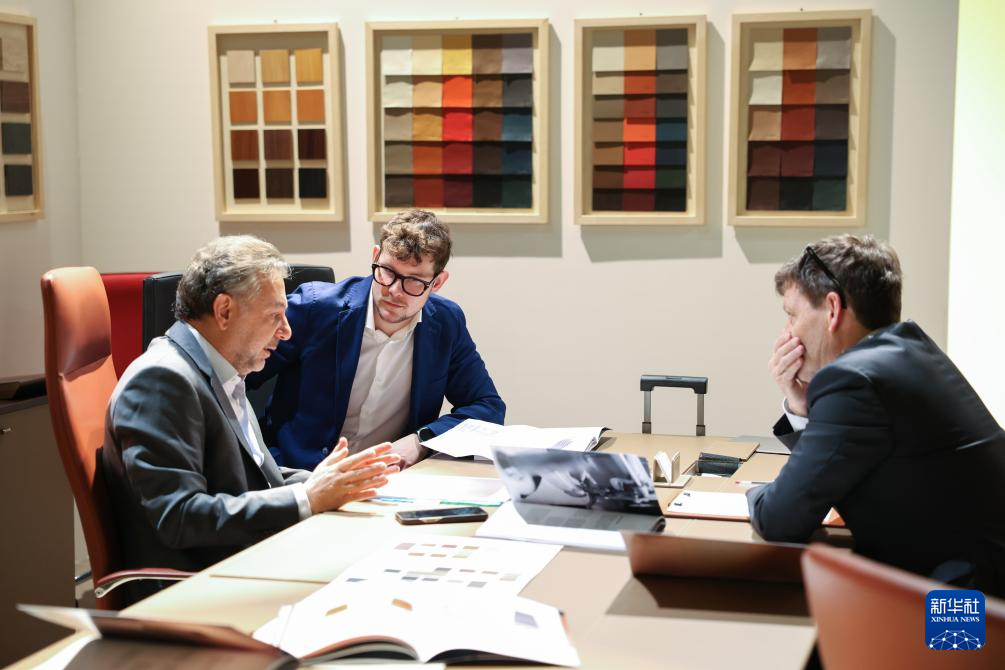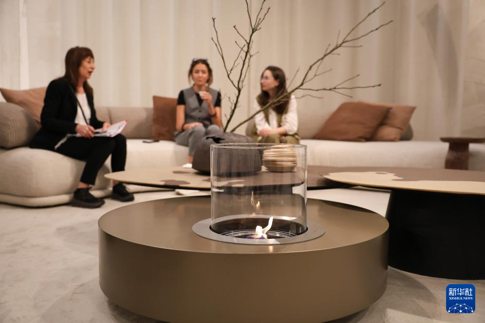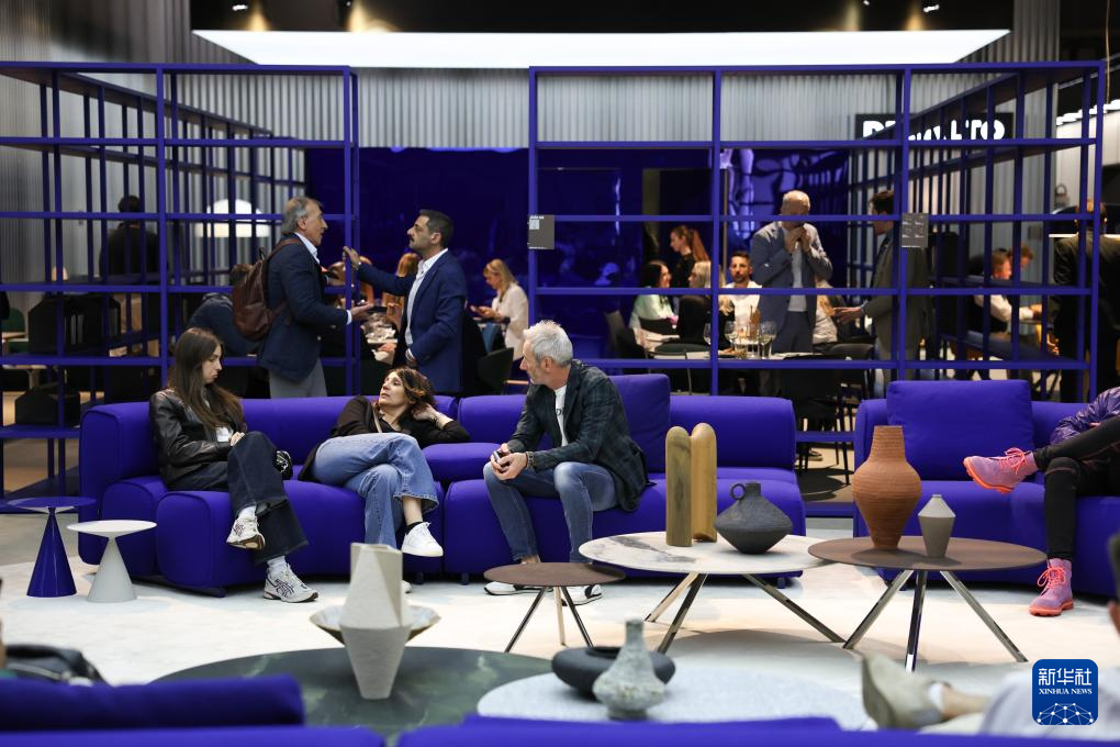 4月22日,在意大利米兰国际会展中心,展商在米兰家具展上洽谈。