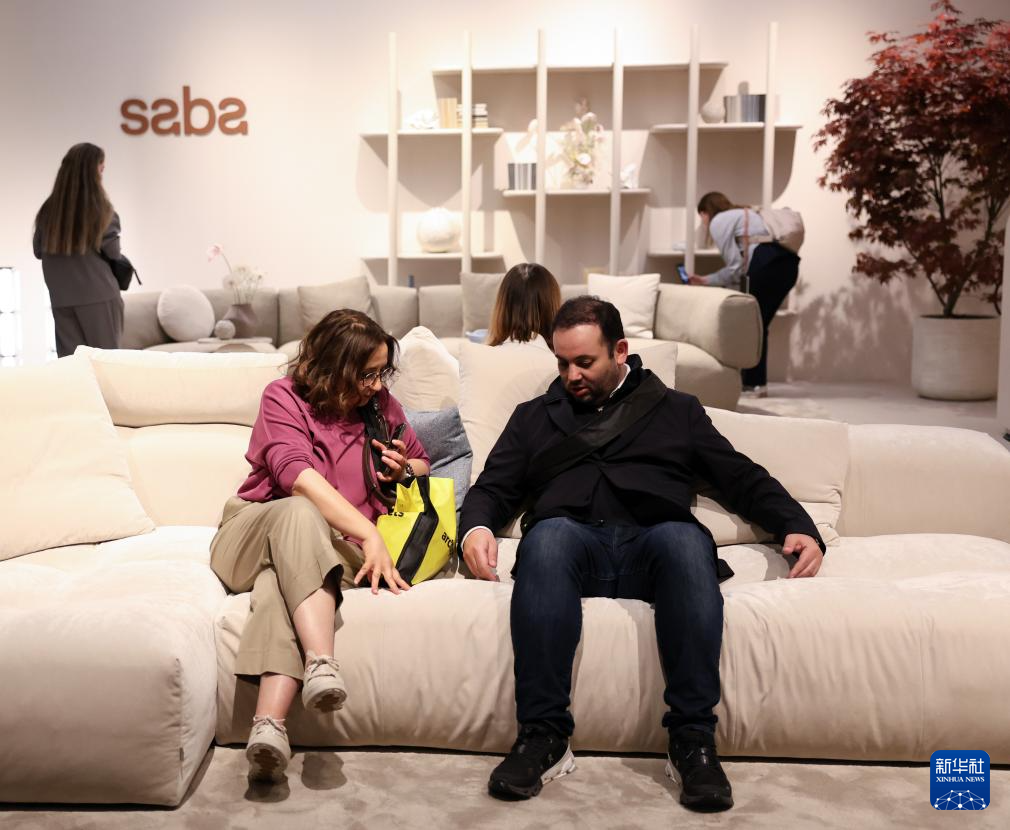 4月22日,在意大利米兰国际会展中心,人们在米兰家具展上体验一款沙发。