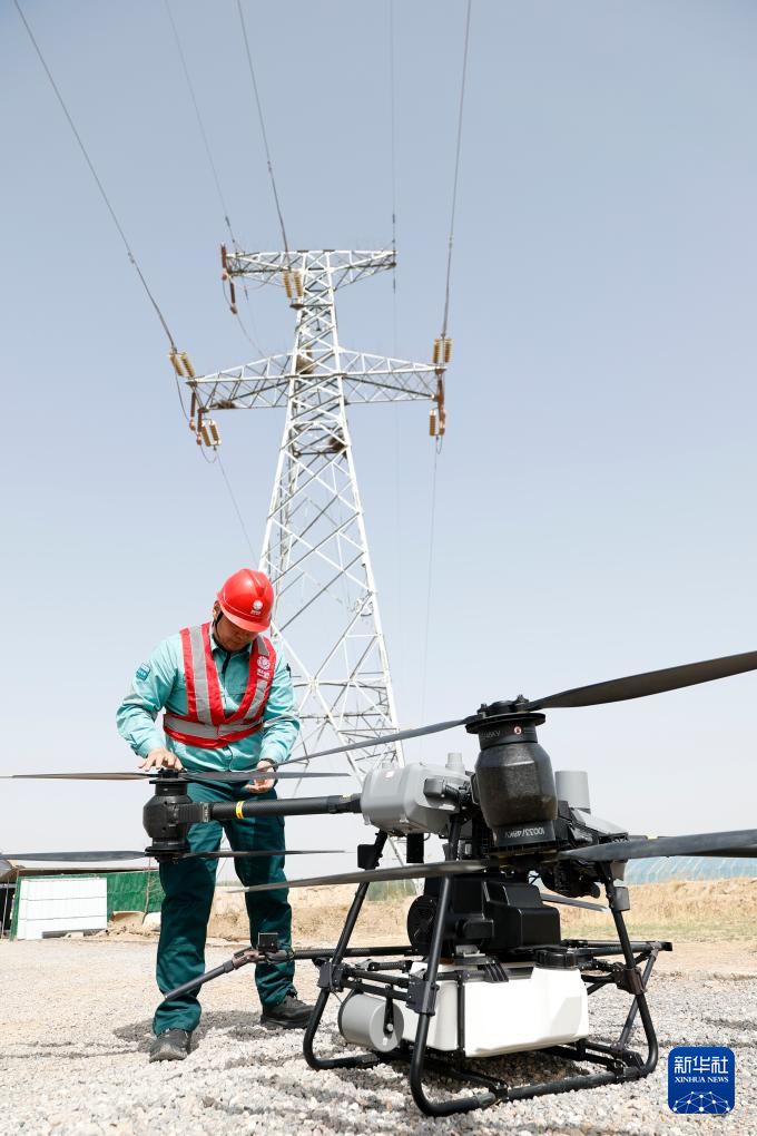 4月23日,国网银川供电公司输电运检中心员工准备操作重载多旋翼无人机对110千伏沙永线70号杆塔瓷质绝缘子串开展冲洗作业。