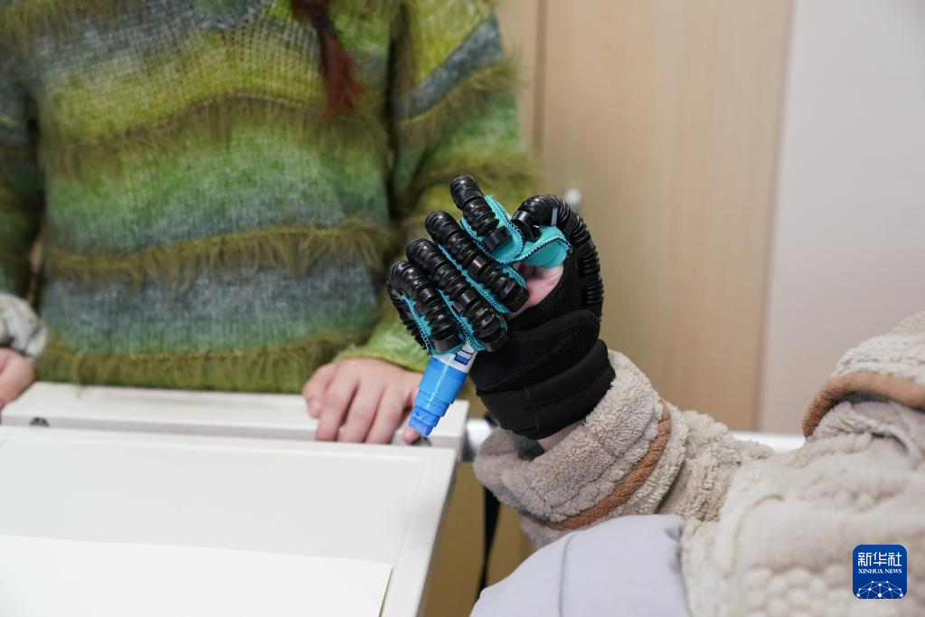3月28日,邓先生通过脑机接口控制外骨骼握笔绘画。