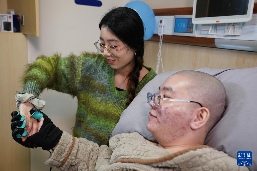 3月28日,邓先生通过脑机接口控制外骨骼和妻子握手。