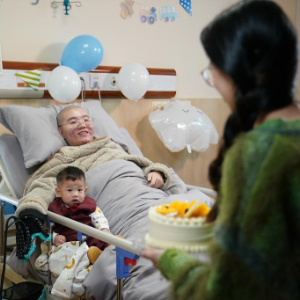 3月28日,邓先生通过脑机接口控制外骨骼给蛋糕插上蜡烛。