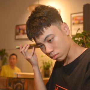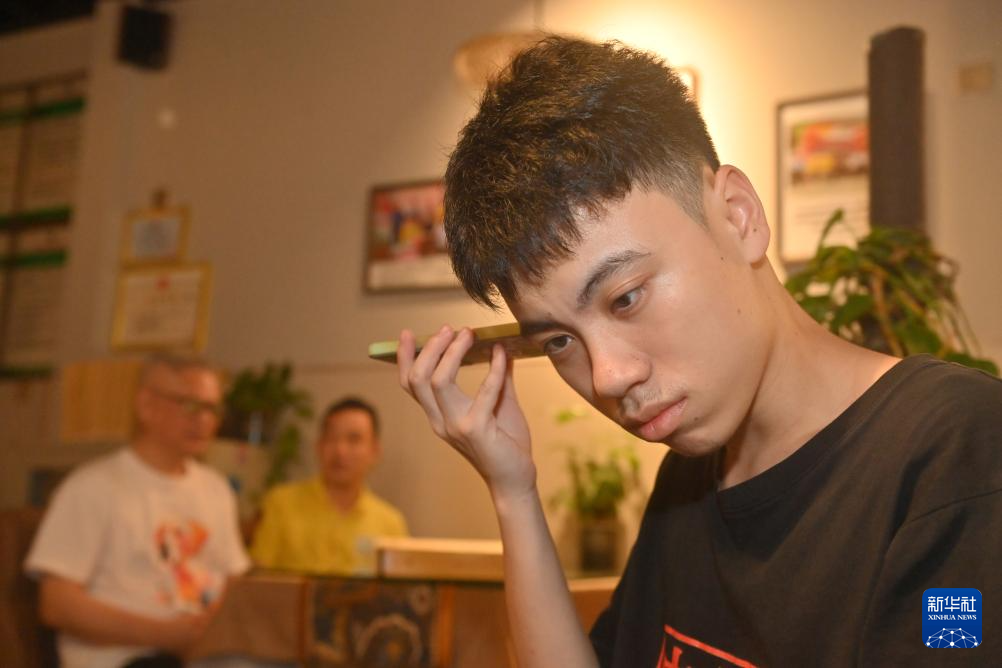 4月22日,在广西南宁明秀东路的盲人读书角,视障人士施奎铭(右一)借助手机语音功能学习。